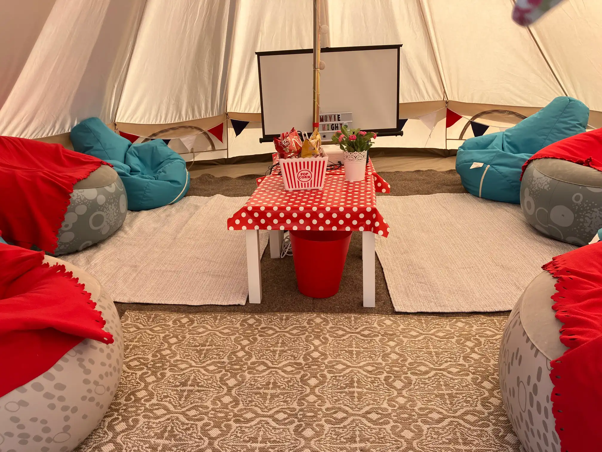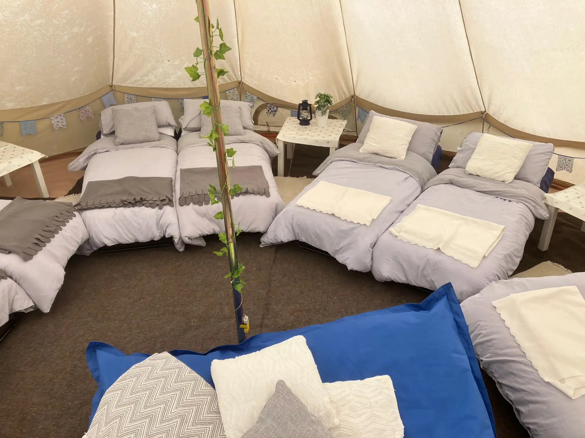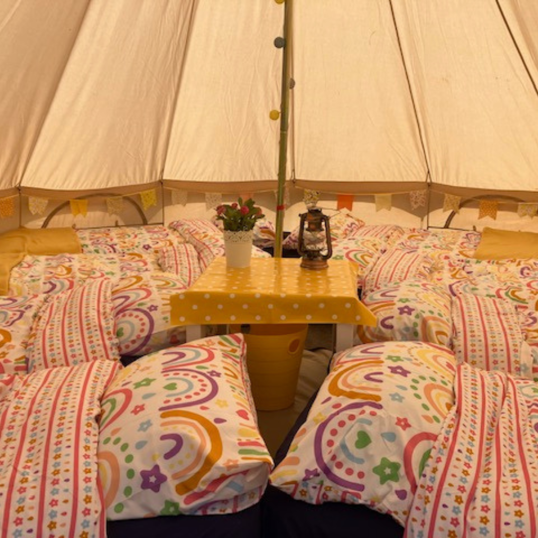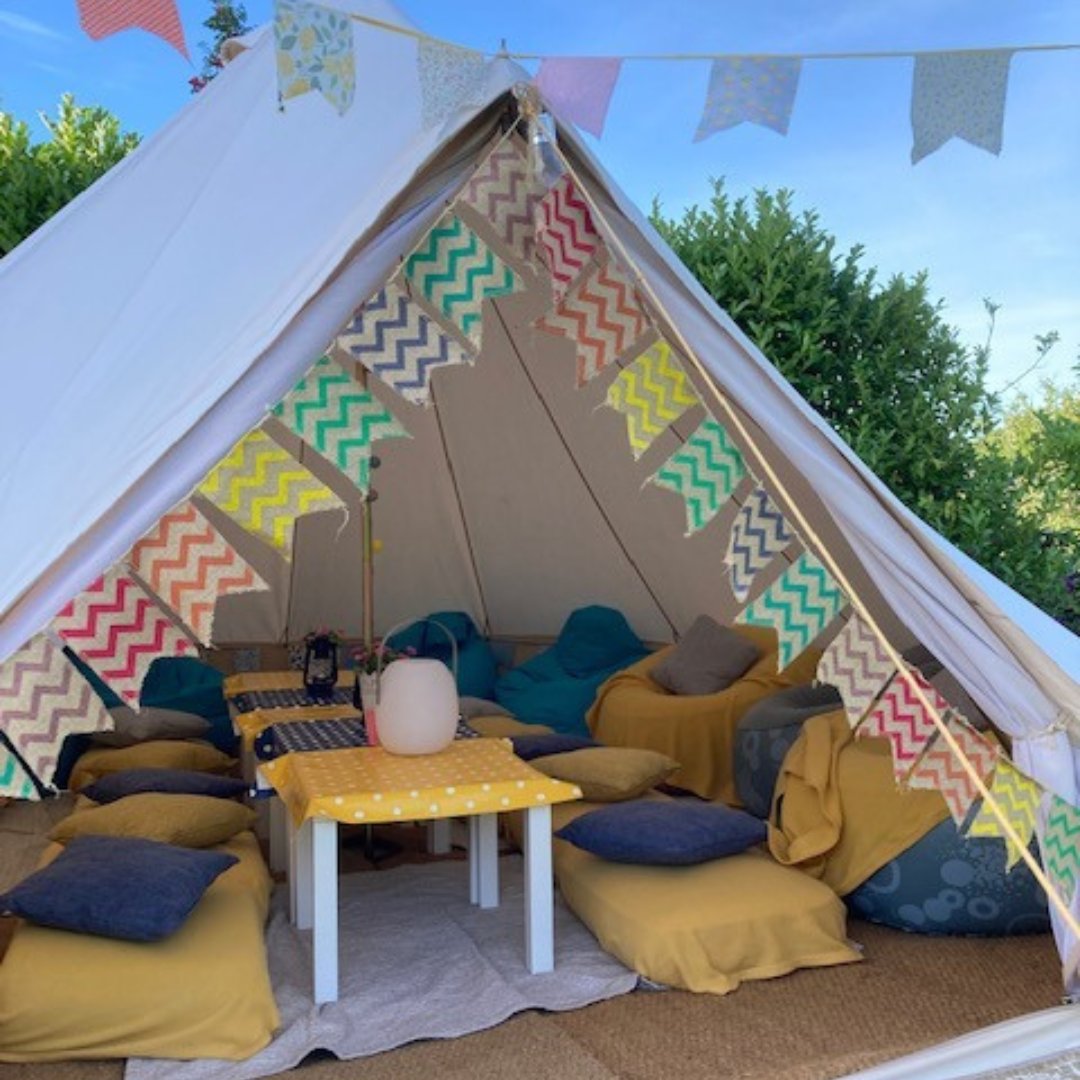 Need more space for birthday/ hen party, giant sleepover or need a quiet space for an event such as a yoga retreat or wedding? Our spacious 7m bell tent has bags of room, can sleep upto 12 , message us for a quote.