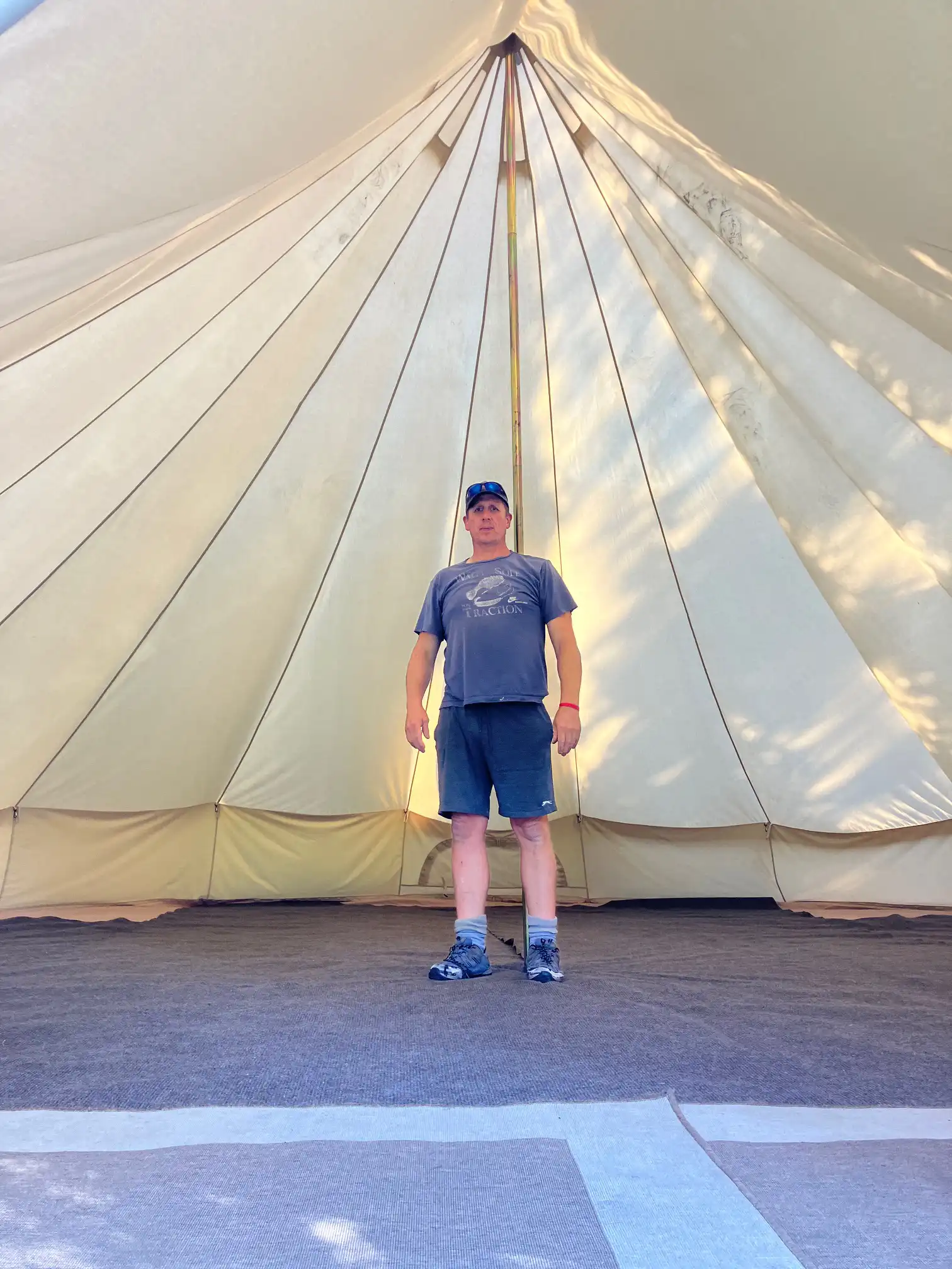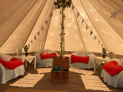 Traditional 5m Bell Tent with built in ground sheet, cosy carpets, bunting and lighting