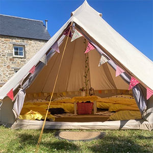 Traditional 5m Bell Tent with built in ground sheet (ask about our cosy 3m and 4m bell tents, suitable for 2 and 4 friends respectively)
